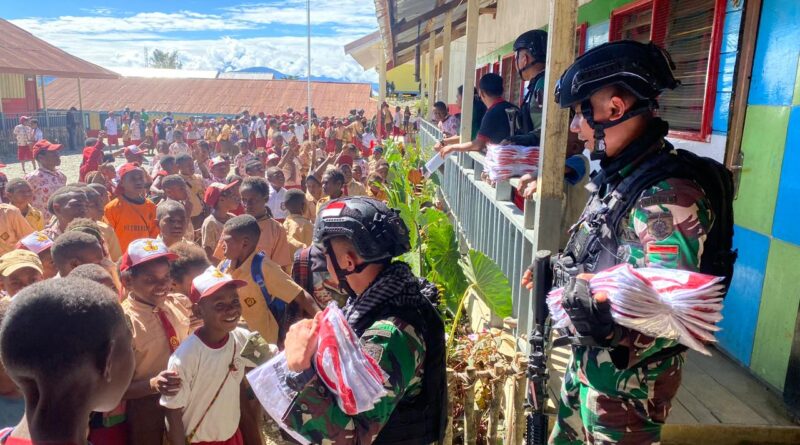 PojokIndo.com – Suasana hening pecah dengan sorak-sorai suara ratusan siswa SD yang bergemuruh menyambut kedatangan personel Satgas Yonif Para Raider 330/Tri Dharma. Para Ksatria Tri Dharma datang untuk membagikan ratusan kaos dan tas kepada Siswa SD YPPK Bilogai di Distrik Sugapa, Kabupaten Intan Jaya, Papua Tengah, Senin (31/7/2023).