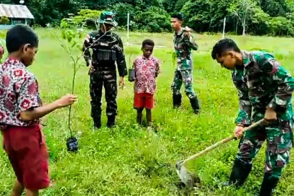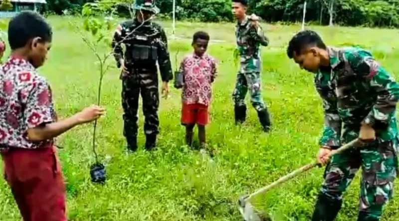 POJOKINDO.com, JAYAPURA – Satgas Pamtas RI-PNG Sektor Utara, Batalion Infantri 122/Tombak Sakti yang berada di bawah Kolakopsrem 172/PWY Pos Koki B Pitewi menyosialisasikan reboisasi kepada siswa SD YPK Pikere, Distrik Arso Timur, Kabupaten Keerom, Papua.