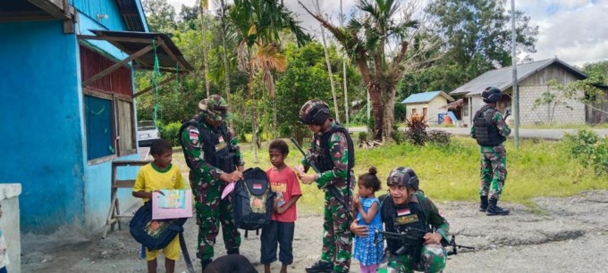 Di sela menjalankan tugas dan fungsinya, Satgas Yonif 122/TS Membagikan perlengkapan sekolah kepada anak-anak Kampung Kalibom, Selasa (24/10/2023).