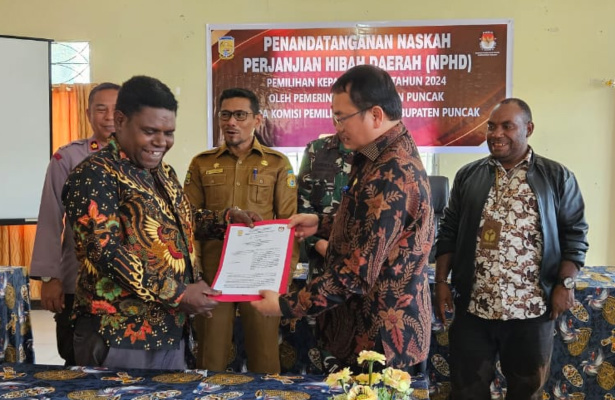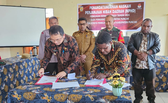 Puncak, POJOKINDO.com – Penjabat Bupati Puncak Ir Darwin Tobing bersama Ketua KPU Puncak Yofie Wonda, ST menandatangani Naskah Perjanjian Hibah Daerah Tahun 2023 senilai Rp90 miliar untuk penyelenggaraan tahapan Pilkada 2024.