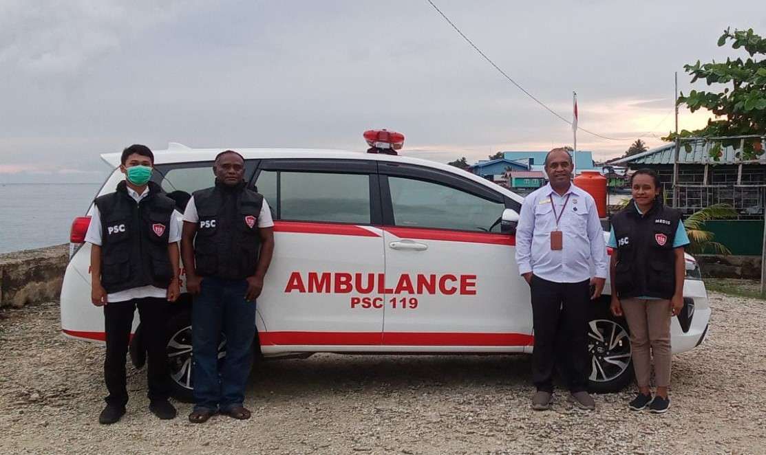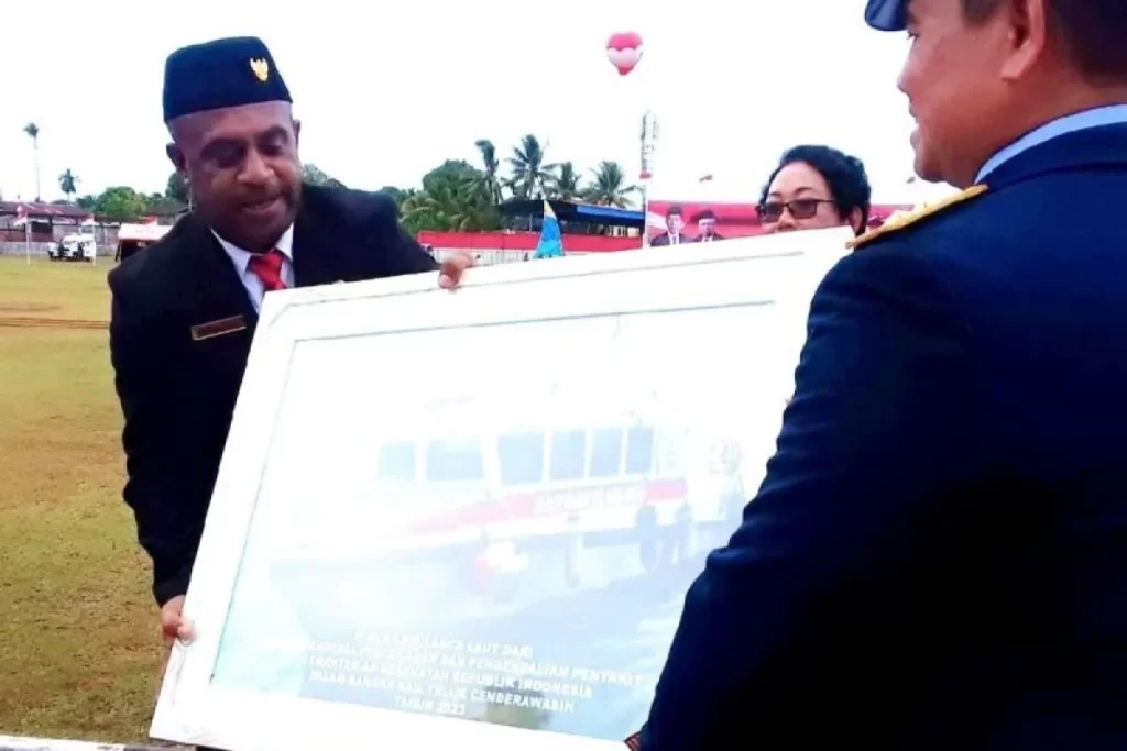 Kepala Dinas Kesehatan Biak Numfor, Papua Daud Nathaniel Duwiri M.Kes menerima bantuan hibah satu unit kendaraan ambulans laut dari Dirjen Pencegahan Pengendalian Penyakit Kementerian Kesehatan RI mendukung Sail Teluk Cenderawasih.(Pojokindo.com/Khoirul Anam)
