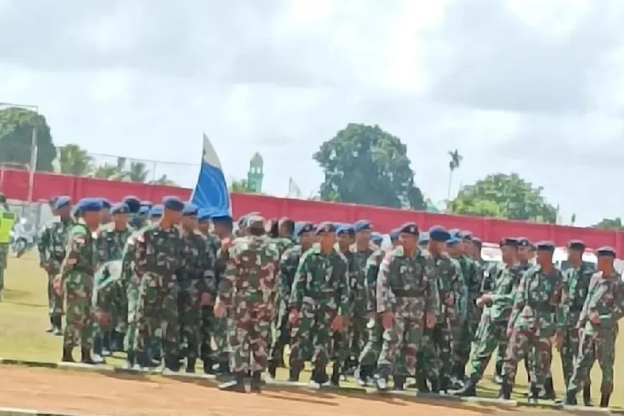 Personel gabungan pengamanan TNI/Polri dilepas apel kesiapan pengamanan kumjungan Presiden Joko Widodo di Biak, Selasa (21/11) dipimpin Komandan Korem 173/PVB selaku Dansatgas Pengamanan VVIP Brigjen TNI Franz Y.Purba seusai gelar pasukan.(Dok. Pojokindo.com/KA)