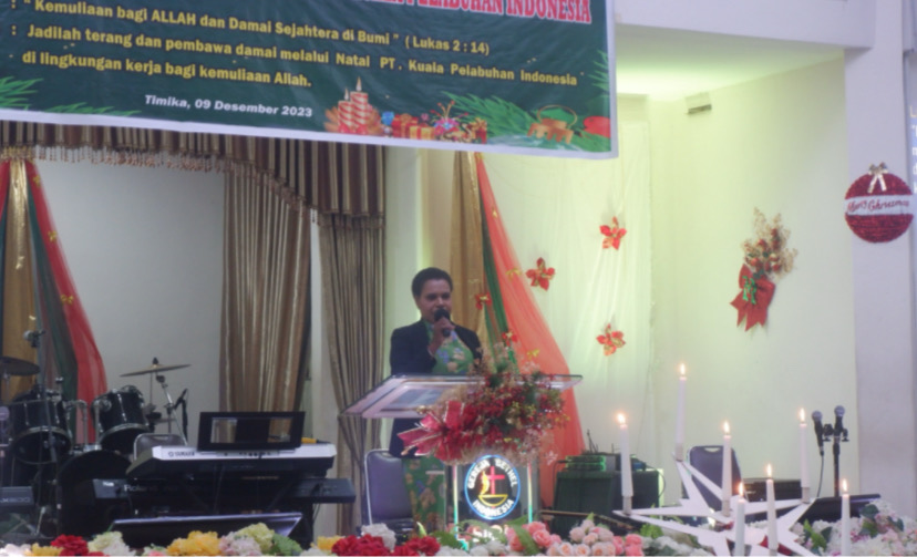 TIMIKA, POJOKINDO.com – Sejumlah Pimpinan dan karyawan PT. Kuala Pelabuhan Indonesia (KPI) Mimika mengikuti ibadah syukur dan perayaan Natal yang digelar di Gedung Gereja GBI Sion, Timika Indah, Mimika, Papua Tengah, Sabtu (9/12/2023) malam.