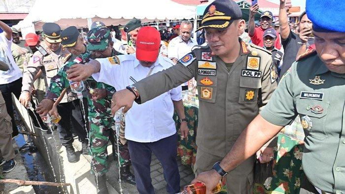 Pj Bupati Sarmi Markus Mansnembra saat memusnkahkan barang bukti miras hasil razia kamtibmas aparat gabungan.