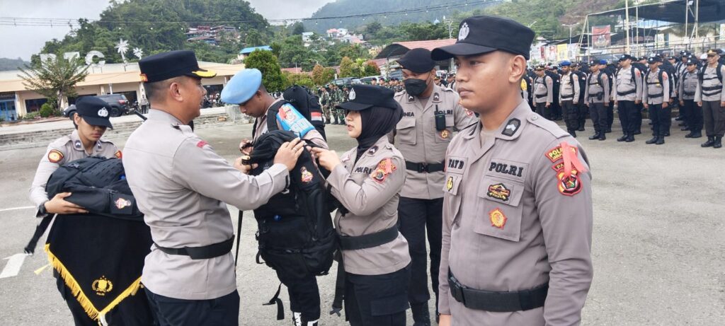 JAYAPURA, POJOKINDO.com – Polresta Jayapura Kota menggelar apel pergeseran pasukan dalam rangka pengamanan TPS Operasi Mantap Brata Cartenz 2023-2024, Sabtu (10/2/2024).