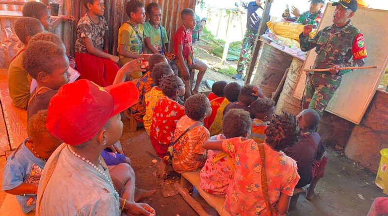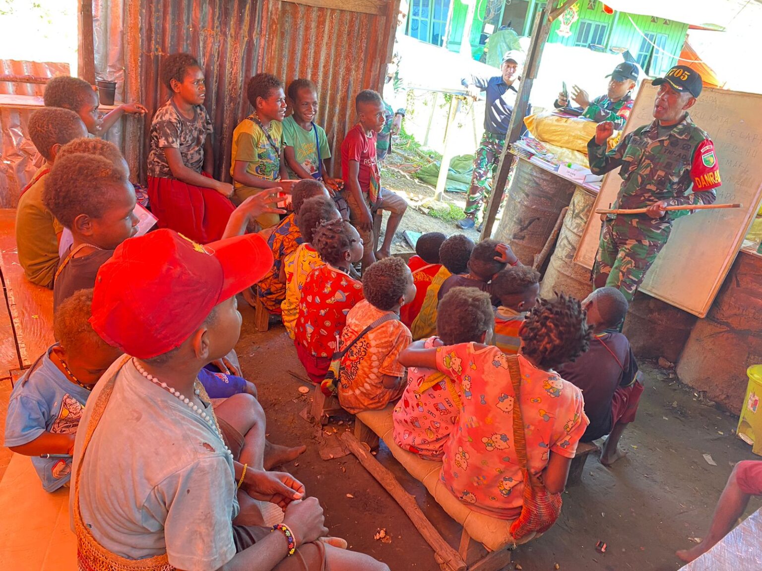 INTAN JAYA, POJOKINDO.com – Dalam upaya menanamkan nilai-nilai Pancasila dan menumbuhkan jiwa nasionalisme sejak dini, Danramil 1705-05/Homeyo, Lettu Inf Marselus Tunyanan, mengajak siswa-siswi SD Inpres Pogapa untuk mengikuti kegiatan belajar menulis, membaca, serta menghafal lagu-lagu nasional dan butir-butir Pancasila.