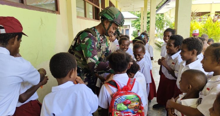 POJOKINDO.COM -Jayapura- Satuan Tugas Pengamanan Perbatasan (Satgas Pamtas) Republik Indonesia-Papua Nugini (RI-PNG) Mobile Yonif 10 Marinir/SBY menunjukkan kepedulian terhadap dunia pendidikan di wilayah penugasan. Personel satgas membagikan perlengkapan sekolah kepada anak-anak di sekitar Pos Imsun, Papua Barat Daya, Kamis (28/08/2025).