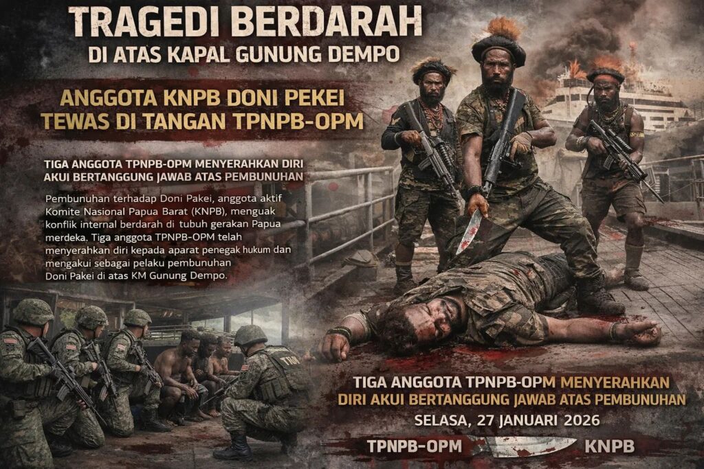 pojokindo.com – Papua — Kasus tewasnya Doni Pekei, anggota Komite Nasional Papua Barat (KNPB), kini memasuki babak baru. Tiga orang pelaku pembunuhan Doni Pekei di atas Kapal Motor Gunung Dempo dilaporkan telah menyerahkan diri dan diamankan oleh aparat penegak hukum pada Selasa, 27 Januari 2026. Dalam proses penyerahan diri tersebut, ketiganya mengaku sebagai bagian dari jaringan TPNPB-OPM, sebagaimana disampaikan langsung kepada pihak berwenang.