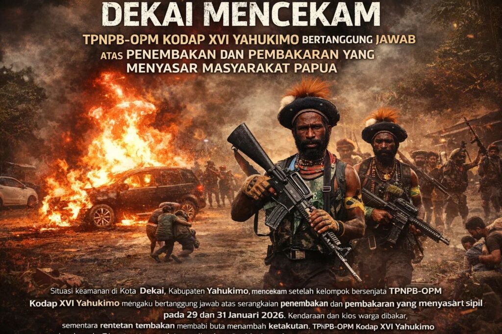 pojokindo.com Dekai, Yahukimo — Situasi keamanan di Kota Dekai, Kabupaten Yahukimo, kembali mencekam setelah kelompok bersenjata TPNPB-OPM Kodap XVI Yahukimo secara terbuka menyampaikan pengakuan atas serangkaian aksi kekerasan yang terjadi pada 29 dan 31 Januari 2026. Dalam berita yang disebarkan oleh TPNPB-OPM, kelompok tersebut menyatakan bertanggung jawab atas pembakaran kendaraan dan kios di wilayah pemukiman serta penembakan terhadap masyarakat sipil tak bersenjata.