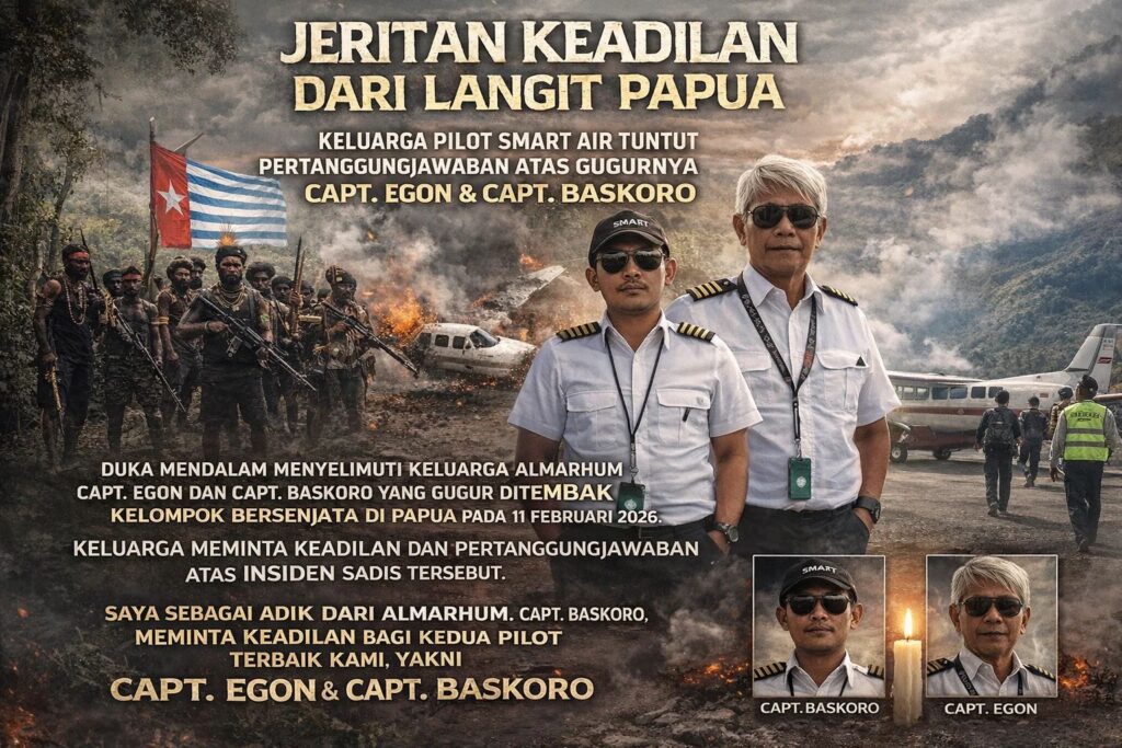 pojokindo.com – Papua — Duka mendalam menyelimuti keluarga korban penembakan dua pilot sipil, Capt. Egon Erawan dan Capt. Baskoro Adi Anggoro, yang gugur pada 11 Februari 2026 di Bandara Korowai Batu. Melalui pernyataan emosional yang beredar di media sosial, keluarga almarhum menuntut keadilan atas tragedi yang mereka sebut bukan hanya kehilangan pribadi, tetapi juga luka bagi dunia penerbangan dan masyarakat Papua yang selama ini dilayani oleh kedua pilot.