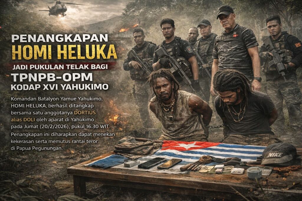 pojokindo.com– Yahukimo, Papua Pegunungan — Penangkapan Komandan Batalyon Yamue, Homi Heluka, pada Jumat (20/2/2026) di sekitar Kantor DPR Yahukimo menjadi perkembangan signifikan dalam upaya penegakan hukum di Papua Pegunungan. Ia diamankan bersama seorang anggotanya, Dortius alias Doli, dan kini menjalani pemeriksaan intensif di Polres Yahukimo. Aparat menilai penangkapan ini sebagai langkah strategis dalam menekan eskalasi kekerasan yang selama ini terjadi di wilayah Dekai dan sekitarnya.
