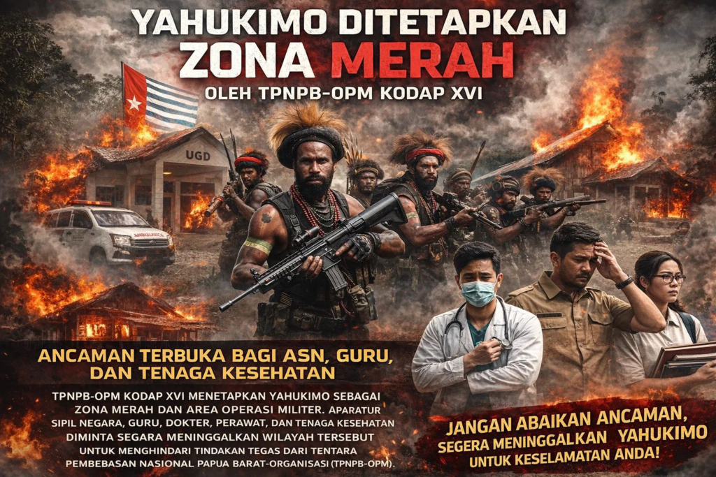 pojokindo.com Yahukimo, Papua Pegunungan — Situasi keamanan kembali memanas setelah TPNPB-OPM Kodap XVI Yahukimo secara terbuka menetapkan wilayah tersebut sebagai “zona merah” dan area operasi militer. Pernyataan ini disampaikan melalui pesan suara yang beredar di media sosial, berisi peringatan keras kepada aparatur pemerintah, tenaga kesehatan, dan masyarakat yang terlibat dalam pelayanan publik agar segera meninggalkan wilayah tersebut.