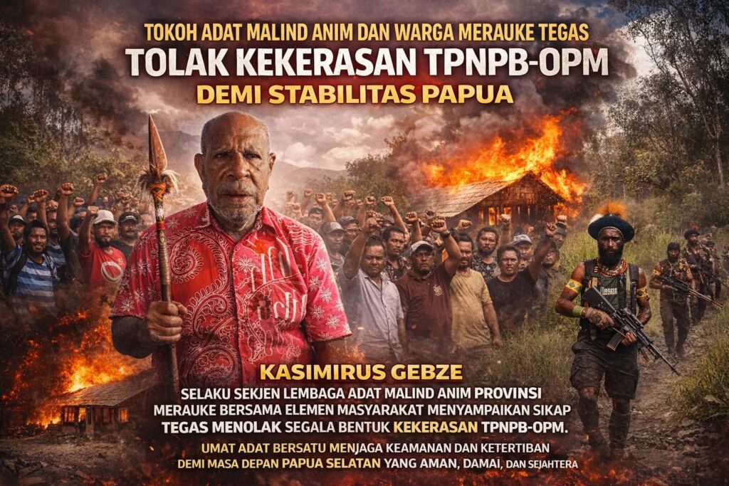 pojokindo.com – Merauke, Papua Selatan — Tokoh masyarakat adat Papua Selatan, Kasimirus Gebze, selaku Sekretaris Jenderal Lembaga Adat Malind Anim Provinsi Merauke, bersama elemen masyarakat menyampaikan sikap tegas menolak segala bentuk kekerasan yang dilakukan oleh kelompok bersenjata TPNPB-OPM. Pernyataan ini lahir dari keprihatinan mendalam terhadap situasi keamanan yang dinilai mengganggu ketertiban dan rasa aman masyarakat.