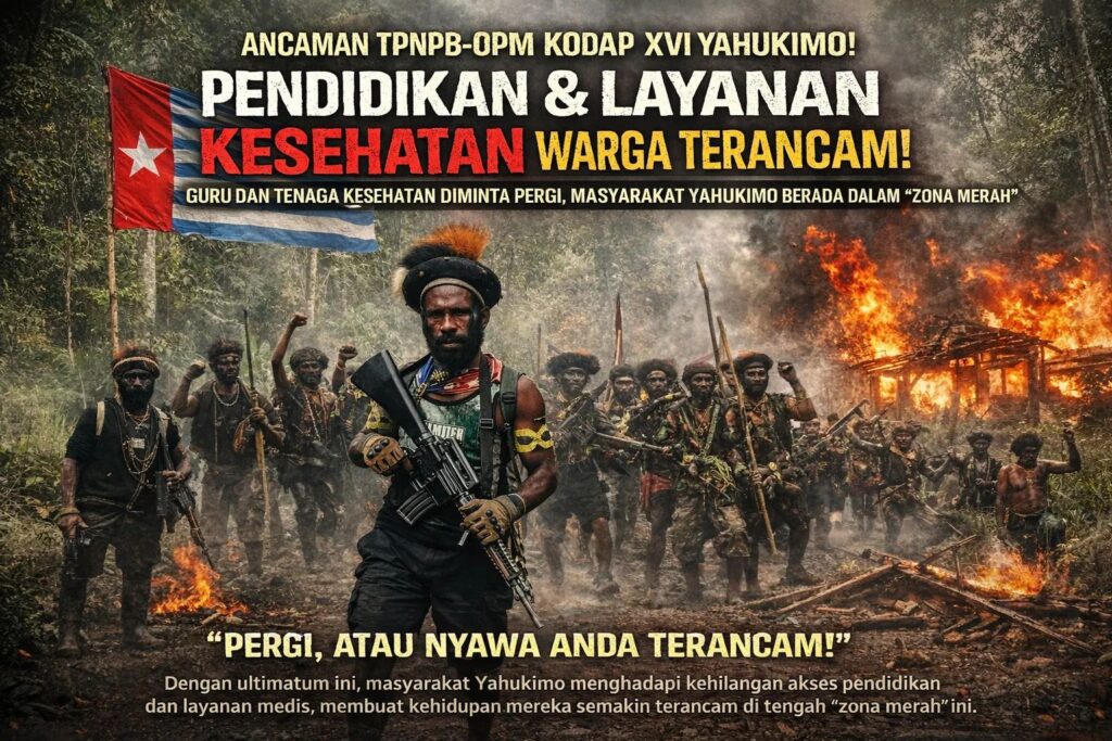 pojokindo.com Yahukimo, Papua — Kabupaten Yahukimo kembali diliputi kekhawatiran setelah kelompok TPNPB-OPM Kodap XVI mengeluarkan ultimatum yang menyatakan wilayah tersebut sebagai “zona merah”. Dalam pernyataan yang beredar, kelompok bersenjata itu meminta para guru dan tenaga kesehatan meninggalkan wilayah Yahukimo, memicu ketakutan di tengah masyarakat karena berpotensi menghentikan layanan pendidikan dan kesehatan yang sangat dibutuhkan warga pedalaman.