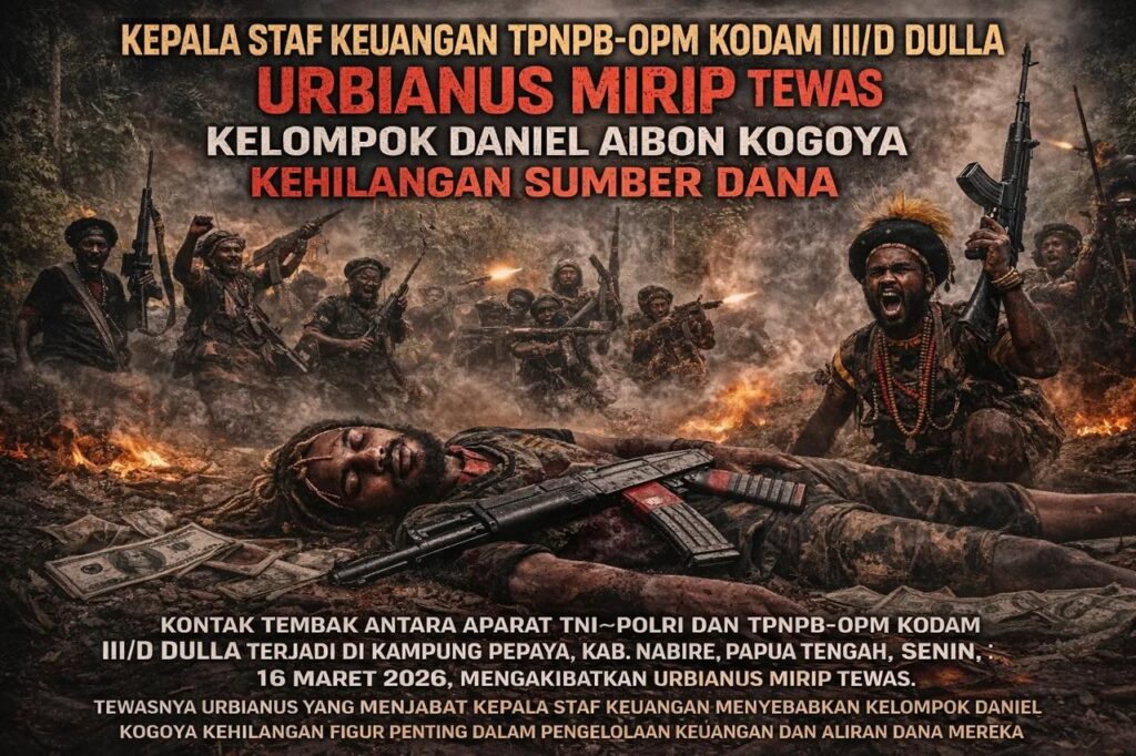 pojokindo.com Nabire, Papua Tengah — Kontak tembak antara aparat TNI–Polri dan kelompok TPNPB-OPM Kodam III/D Dulla terjadi di Kampung Pepaya pada Senin, 16 Maret 2026. Dalam peristiwa tersebut, Urbianus Mirip, yang menjabat sebagai Kepala Staf Keuangan TPNPB-OPM Kodam III/D Dulla, dilaporkan tewas. Pimpinan kelompok, Daniel Aibon Kogoya, mengonfirmasi kematian tersebut.