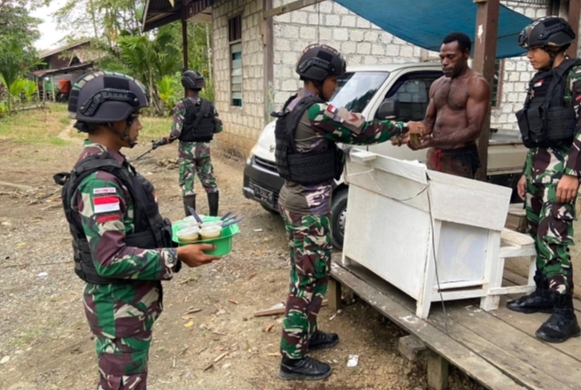 JAYAPURA, POJOKINDO.com – Satuan Tugas Pengamanan Perbatasan (Satgas Pantas) RI-PNG Yonif 122/Tombak Sakti, Pos Ujung Karang Kipur B berbagi kasih