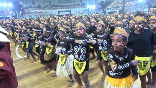 JAYAPURA, POJOKINDO.com – Sebanyak 2.600 anak-anak dari Kota dan Kabupaten Jayapura pecahkan rekor muri tampilkan tarian kolosal di puncak peringatan Hari Anak Nasional (HAN)